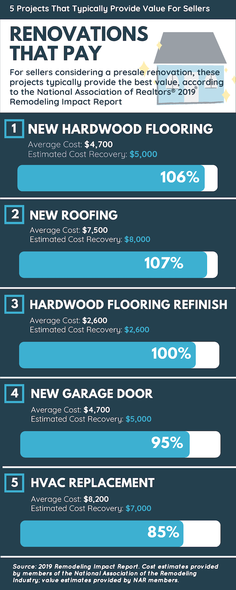 according to the National Association of Realtors® 2019 Remodeling Impact Report.For Sellers considering a pre-sale renovation, these projects typically provide the best value according to the National Association of Realtors® 2019 Remodeling Impact Report.